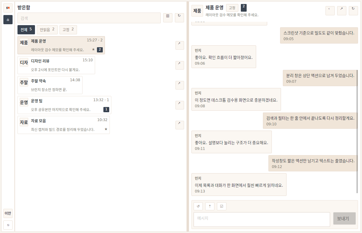 이 저장소는 그 불만을 과격하게 소비하려는 프로젝트가 아니라, 더 조용하고 더 짧고 더 예측 가능한 한국어 메시징 경험을 다시 설계해 보려는 제안입니다. 익숙한 메신저 문법은 존중하되, 반복해서 확인하는 목록, 답장을 미루지 않게 돕는 흐름, 업무적 대화와 사적 대화가 서로 피로를 만들지 않는 구조를 우선합니다.